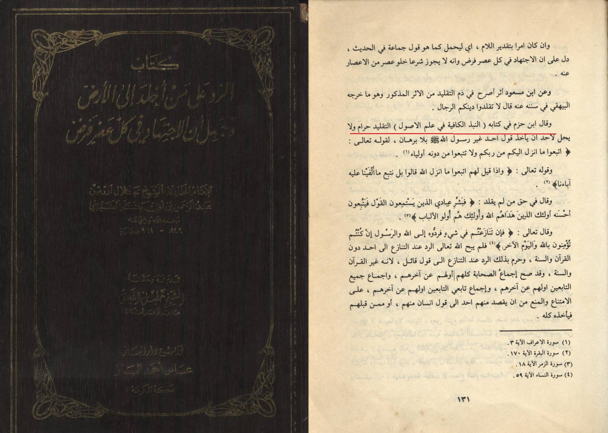 1) Jalaal ud-Deen Suyooti has written a book in refutation of taqleed named: “Ar-Radd Ala Man Akhlad Ilal Ard Wa Jahala Annal Ijtihaad fi Kulli Asrin Fardh”, and in this book he brought a chapter named: “Fasaad ut-Taqleed (Abberrance of Taqleed)”, and in it, he narrated from Ibn Hazam that: “Taqleed is Haraam” [Pg 131]