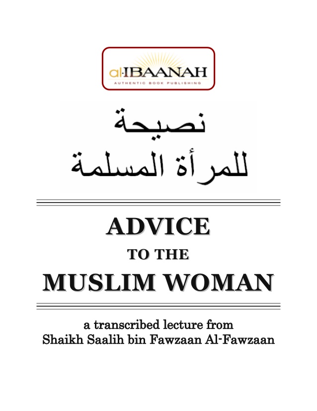 This book is a complete translation of a transcribed lecture from Shaikh Saalih Al-Fawzaan entitled: “Naseehah Lil-Mar’at-il-Muslimah” (Advice to the Muslim Woman). The source used for this translation was the book Muhaadaraat fil-‘Aqeedah wad-Da’wah, a large compilation of over 25 transcribed lectures from Shaikh Saalih Al-Fawzaan on issues of Creed and Methodology (vol. 3, pg. 281-299, Markaz Fajr, 2003 Edition)