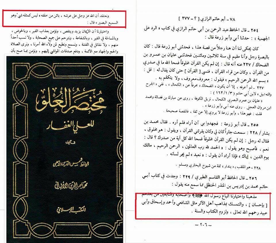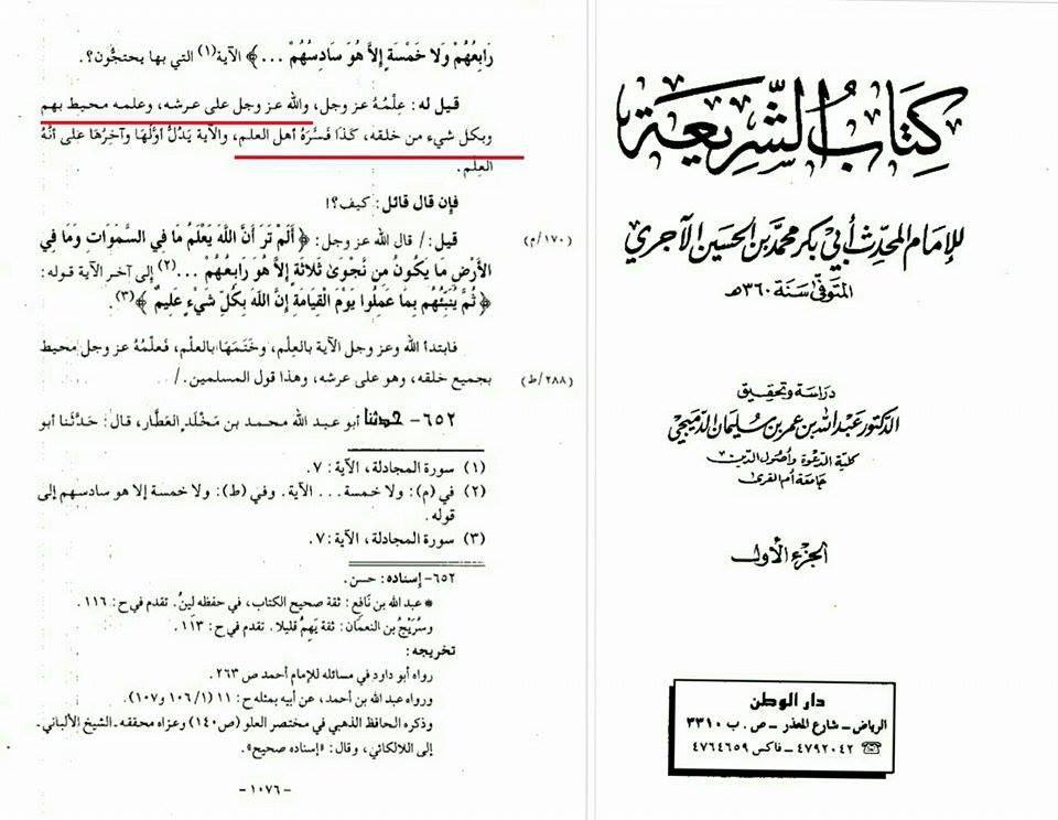ABU JAFAR BIN ABI SHEBAA RH aur USMAN BIN SA’EED AL DARIMI RH se isi tarah ka QAUL isse pehle NAQAL kiya ja chuka hai.HAFIZ ABU BAKAR AL WA’ILI AL SAJZI RH apni KITAB AL IBANAH me kehte hain SAURI RH,MALIK RH,HAMMAD IBN UYAYNAH RH,IBN AL MUBARAK RH,FUZAIL RH,AHMAD RH,IS’HAQ RH sabhi AHLE ILM is baat par MUTTAFIQ hain ki ALLAH TA’ALA apni ZAAT ke saath ARSH par MUSTAWI hai aur apne ILM ke saath HAR JAGA hai (yani uska ILM HAR JAGA hai)