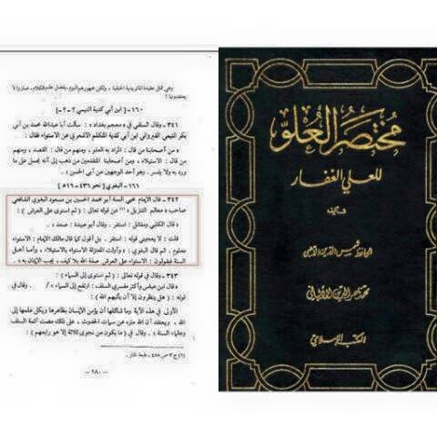 ki IMAM ABU NASAR AL SAJZEE RH (MUTAWAFFA 444 HIJRI) farmate hain hamare AIMMA jaise IMAM SUFIYAN THAURI RH, IMAM MALIK RH, HAMMAD IBN SALMA RH, HAMMAD IBN ZAID RH , SUFIYAN IBN UYAYNA RH, FUZAIL RH,IMAM IBN MUBARAK RH aur IMAM AHMAD RH aur IS’HAAQ RH wagaira se ye log kehte hain ki beshak ALLAH SUBHANAHU WATA’ALA ARSH par hai aur USKA ILM har jaga hai aur wo AASMANON par NAAZIL hota hai
