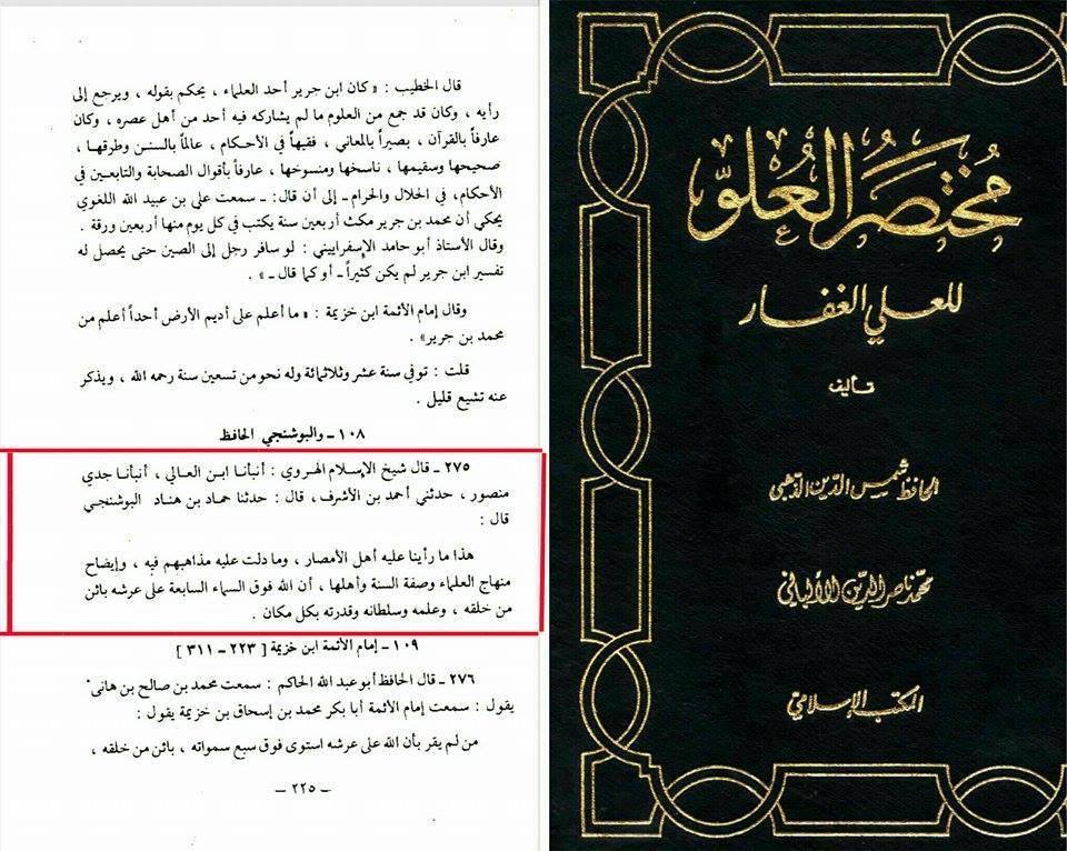 ki ALLAH apne AASMAN ke OOPAR hai jaisa ki usne hame KHABAR di hai QURAN me aur RASOOL SALLALLAHU ALAIHI WASALLAM ki ZUBAN E MUBARAK se jaisa MUSALMAN jante hain apni FITAR se unme ka ALIM aur JAHIL, GULAM aur AZAD, MARD aur AURAT, SAMAJHDAR JAWAN aur BACHCHA isme se jo bhi DUA karta hai to wo apne CHEHRE ko AASMAN ki taraf UTHATA hai aur apne HATHON ko UTHATA hai ALLAH ki taraf ye apne CHEHRE aur HATHON ko OOPAR ki taraf UTHATE hain NICHE ki taraf nahi