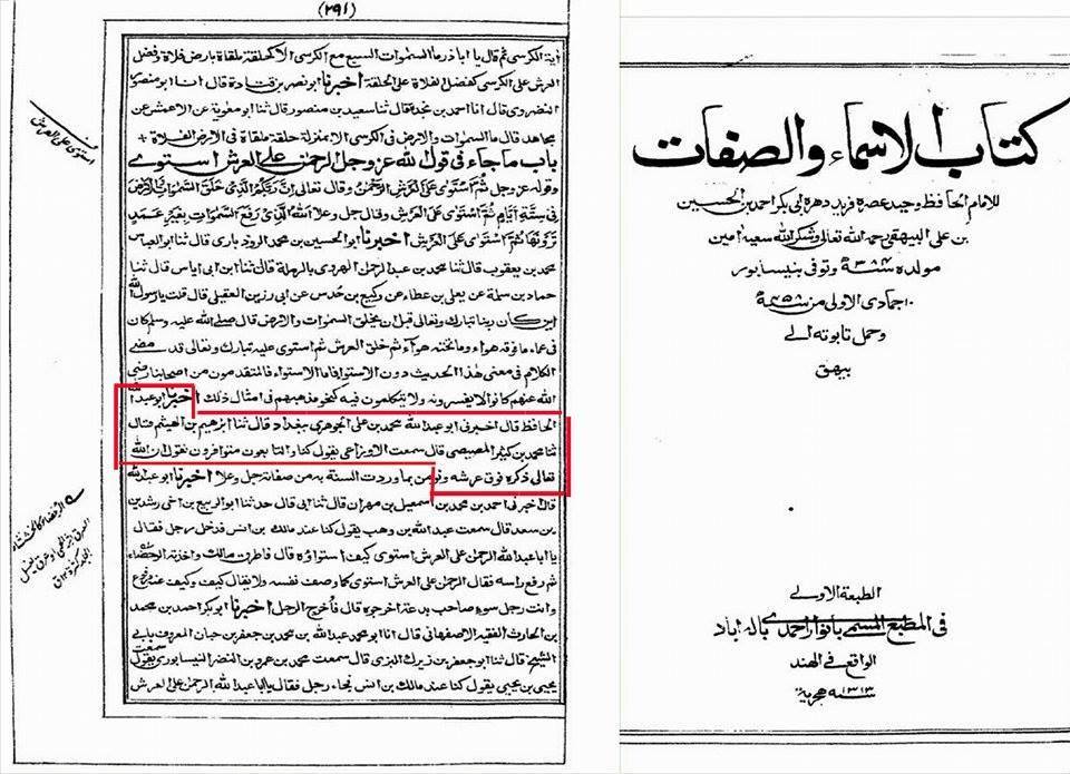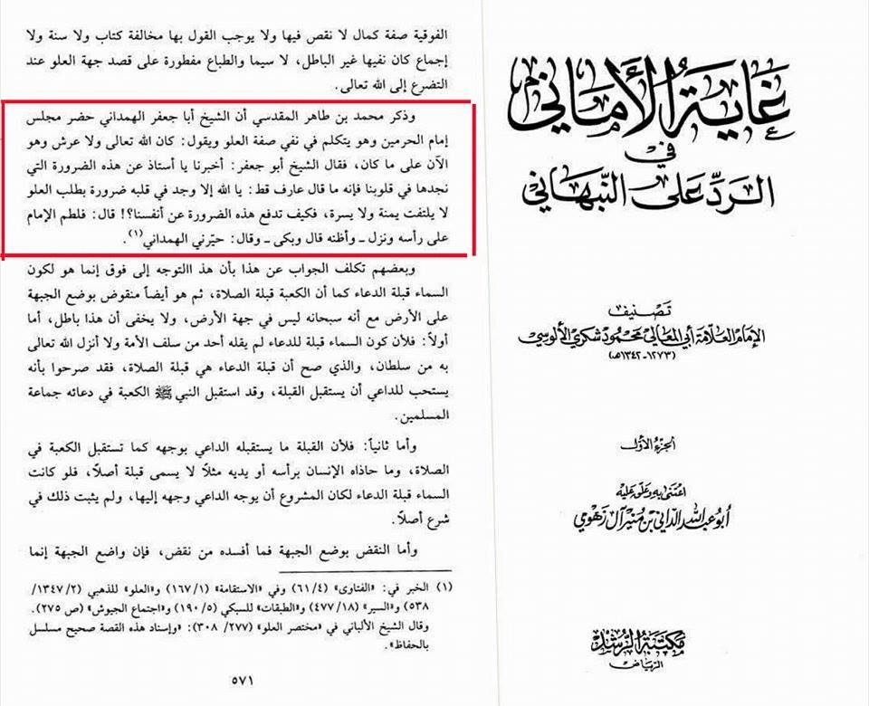 ki IMAM MUHAMMAD IBN TAHIR AL MAQDASI RH ne ZIKR kiya ki SHAIKH ABU JAAFAR AL HAMDANI RH IMAM UL HARMAIN AL JUWAYNI RH ki MAJLIS me aaye jaha par IMAM UL HARMAIN RH keh rahe the ALLAH ke ULOO me koi TAHQEEQ nahi hai unhone kaha ALLAH hai par ARSH nahi hai ALLAH MAUJOOD hai waha jaha wo hai to IMAM ABU JAFAR RH ne kaha AYE mere USTAAD hame KHABAR dijiye us cheez ke baare me jiske baare me hamare DILON (heart) me kuch SHAK O SHUBA hai jab koi ALLAH ko JANNE waala kehta hai YA ALLAH to uske dil ka RUJHAN BULANDI ki taraf hota hai yani AASMAN ki taraf BAAYEN aur DAAYEN nahi (left and right)? To IMAM UL HARMAIN RH ne IMAM ABU JAFAR RH ke SAR par apne HAATHON se MAARA aur neeche aaye aur IMAM HAFIZ MAQDASI RH ne kaha ki mera GUMAAN hai ki IMAM UL HARMAIN AL JUWAYNI RH rone lage aur ye bhi farmaya HAMDAANI ne mujhe LAJAWAAB kar diyaa