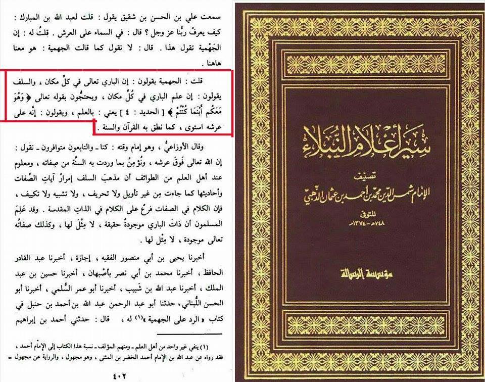 قلت(الذهبي) : الجهمية يقولون : إن الباري تعالى في كل مكان ،والسلف يقولون : إن علم الباري في كل مكان ، ويحتجون بقوله تعالى وَهُوَ مَعَكُمْ أَيْنَ مَا كُنْتُم ْ يعني : بالعلم ، ويقولون : إنه على عرشه استوى ، كما نطق به القرآن والسن