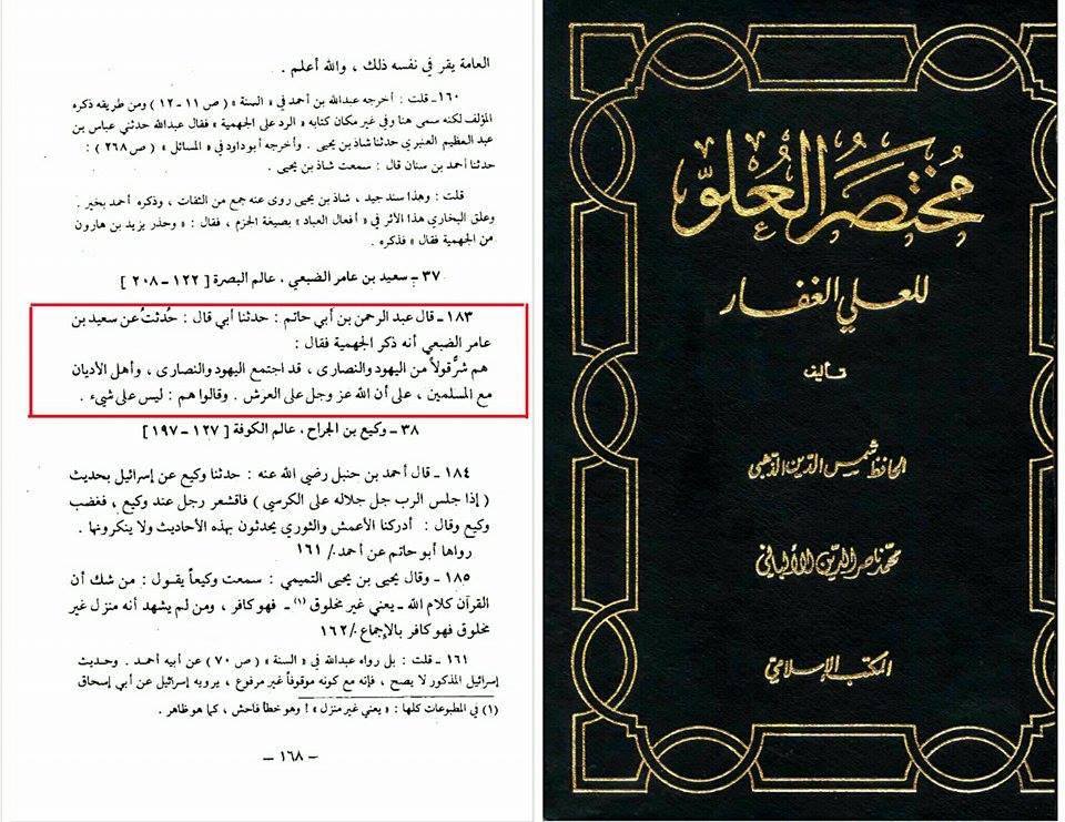 ki RAAWI kehta hai ki IMAM SA’EED IBN AMIR AL ZAB’E (MUTAWAFFA 208 HIJRI) ke pass jab JAHMIYA logo ka zikr hua to unhone farmaya wo log BADTAREEB hain apne AQAYED me YAHOODIYON aur ISAAIYON se,q ki beshak YAHOOD aur ISAYI aur MUSALMAN ka is baat par ITTEFAQ hai ki beshak ALLAH apne ARSH par ASTAWA hua aur ye JAHMIYA kehte hain ki MUSLIM aur YAHOOD aur ISAAYI (is aqeede me) GUMRAHI par hain