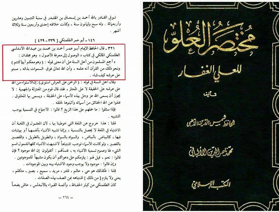 قَالَ الْحَافِظ الإِمَام أَبُو عمر أَحْمد بن مُحَمَّد بن عبد الله الأندلسي الطلمنكي الْمَالِكِي فِي كتاب الْوُصُول إِلَى معرفَة الْأُصُول وَهُوَ مجلدان أجمع الْمُسلمُونَ من أهل السّنة على أَن معنى قَوْله }وَهُوَ مَعكُمْ أَيْن مَا كُنْتُم{ وَنَحْو ذَلِك من الْقُرْآن أَنه علمه وَأَن الله تَعَالَى فَوق السَّمَوَات بِذَاتِهِ مستو على عَرْشه كَيفَ شَاءَ