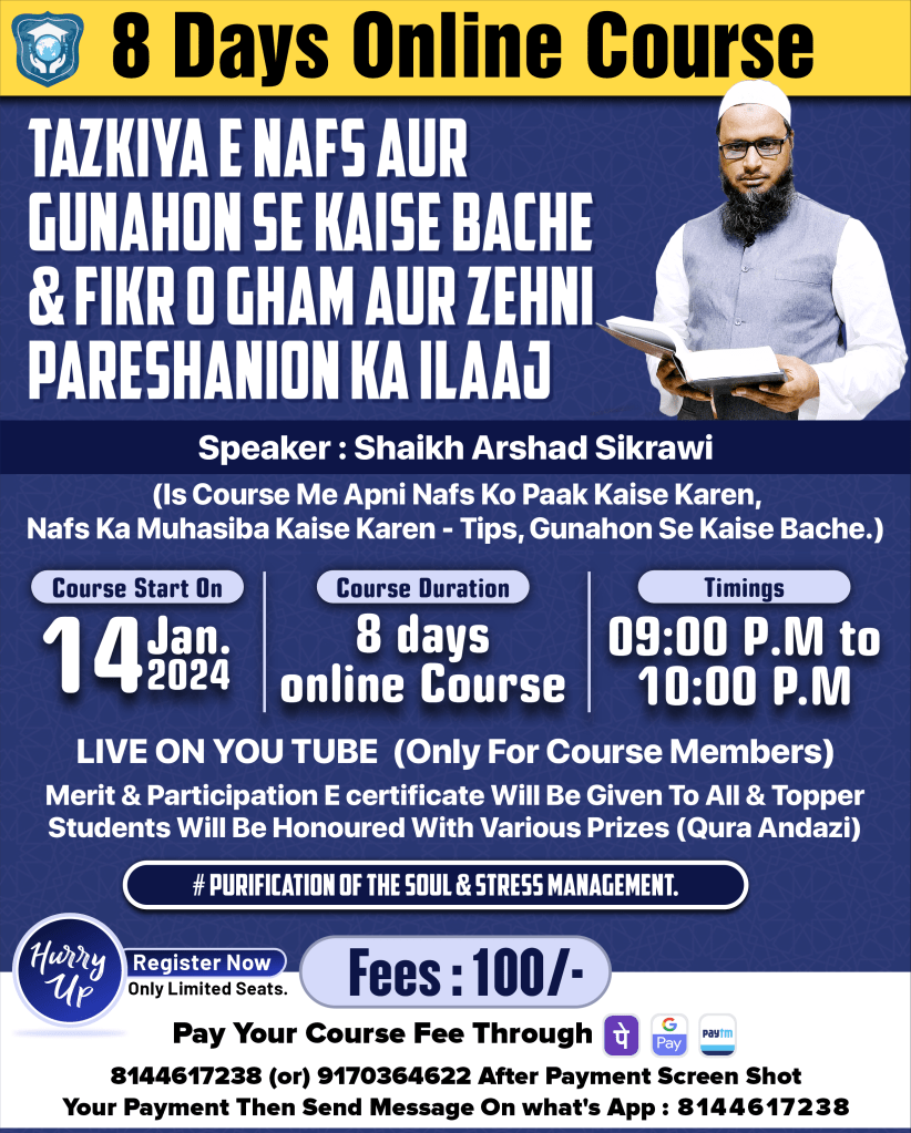 IS COURSE Ki KHASIYAT Ye Hai – Ye Bahut Hi Unique Course Hone Wala Hai. – Aap Seekhenge : NAFS Ko Paak Kaise Karen, Har Din Muhaasiba E Nafs Kaise Karen, Muhasiba E Nafs Kis Tarah Karen, Gunahon Se Kaise Bache, Gunahon Se Bachne Ke Liye Kuch Tips, Fiqr O Gham Se Kaise Nijaat Detail Se, Zehni Pareshanion Ka ILaaj, Bamari Ke Wakt Kaisa Sabr Karen.